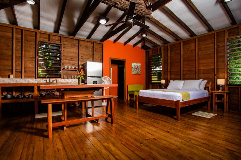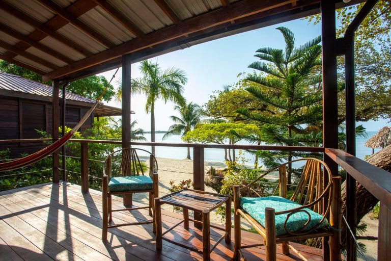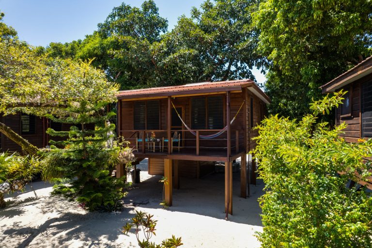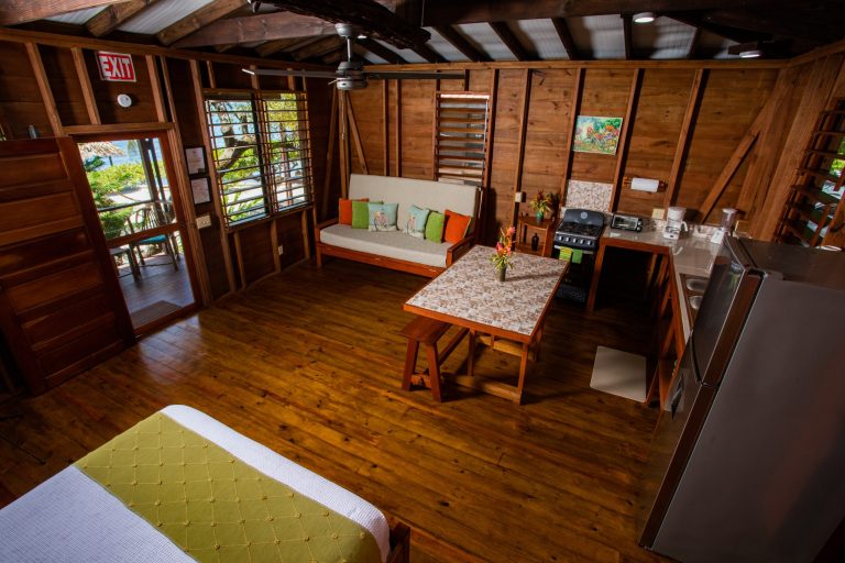 The “Main Deck” Cabana is the most recently renovated cabana, it is spacious and can accommodate two additional guests. It is equipped with a full kitchen that includes a full-size refrigerator, stove with oven, tile top workstation/table, coffee maker, toaster, and blender. It also has a ceiling fan, floor fans, queen size bed, a futon couch that converts to a queen size bed. The private veranda has a hammock and chairs.